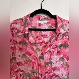 The top is long-sleeved and features a vibrant, colorful pattern predominantly in shades of pink, with images of leopards and tropical leaves. The top has a collar and buttons down the front. The fabric appears to be lightweight and flowy, suitable for casual or semi-casual wear.