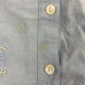 Jane Ashley Button Down Shirt Womens Collared Long Sleeve Denim with Embroidered and Pearl Accents. Has stains on front of shirt.