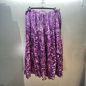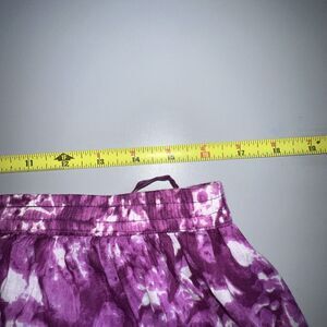 Embrace the free-spirited vibe with this Jane Ashley Skirt in Size Medium. The multiple panels create a beautiful flow and flare, perfect for belly dance or festival wear. The tie-dye pattern in shades of blue and purple draws attention to the skirt, while the ruffle accents and drawstring closure add a touch of femininity.