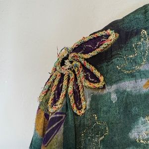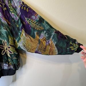 Jane Ashley Vintage 80's 90's Jewel Tone Sparkly Fall Floral Autumn Pattern Embellished Puff Paint Rope Floral Detailing Shoulder Pads Metal YKK Zip Front Elastic Waist Cuffs Dolman Long Sleeves Lined Lightweight Oversized Granola Girl Craftcore Art To Wear Goblincore Retro Kitsch Jacket