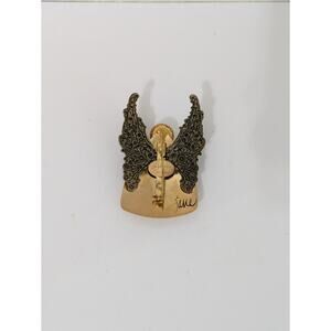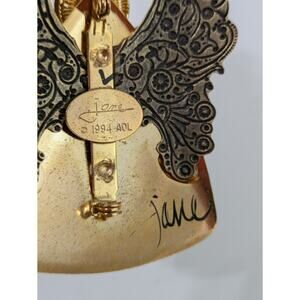 This exquisite vintage brooch pin is a stunning piece of jewelry from the Jane Davis collection. The angelic design is adorned with sparkling rhinestones, adding a touch of love and elegance to any outfit. The brooch is signed and crafted in gold tone, giving it a timeless and classic look. The brooch is perfect for those who appreciate vintage and antique jewelry, and would make a wonderful addition to any collection. Its unique design and beautiful details make it a standout piece that is sure to impress.