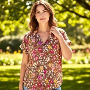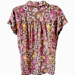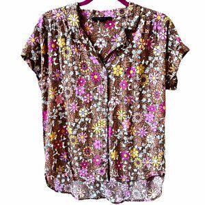 Jane & Delancey button up front blouse. Notched collar. Dropped back hem. Cap sleeves with cuff. Floral print with gold metallic thread stitching. 100% rayon