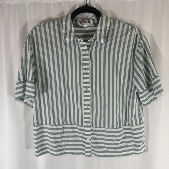 Jane Delancey Blouse Women's Small Green White Striped Short Sleeve Button Up