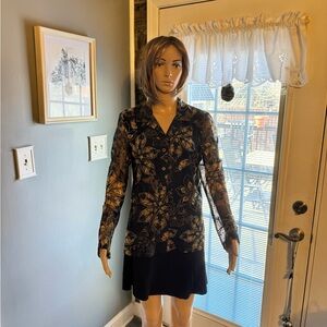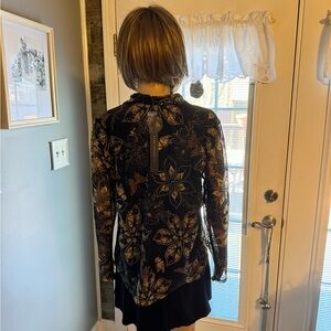 Jane + Delancey Shirt SZ LG NWT. Measures 27” in length from shoulder to bottom of hem. Bust measures 22” from armpit to armpit laying flat. Self is 80% Nylon and 20% Spandex. Lining is 100% Polyester. Black Background Color with Accent colors of Yellows, Tans, Creams and White. The pattern is Butterflies and Flowers. The outer layer is a sheer mesh fabric. Fully lined. The sleeves are all sheer mesh. Full front button closure. This is a very beautiful shirt. Could easily be dressed up or down.