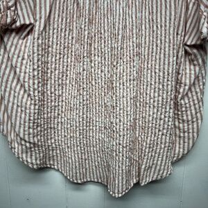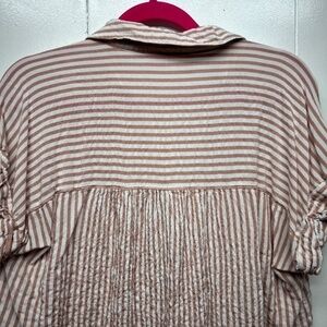 Jane & Delancey women's striped top in pink & cream. Collared. V-neck. Short rolled sleeves. Tail back hem. Relaxed fit. In good used condition. No stains, tears or holes.