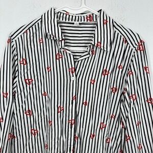 Keywords: Jane + Delancey, striped shirt, heart print, button down shirt, womens top, casual shirt, size medium, red heart, black and white, long sleeve, rayon shirt, embroidered heart, cute shirt, work shirt