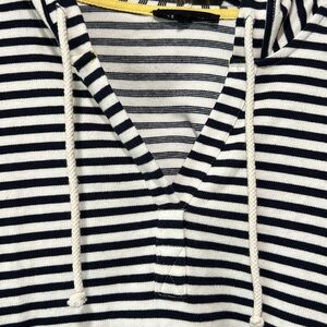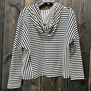 Jane and Delancey brand hooded sweatshirt. Size large. Black & white stripes. Nautical vibes. Hoodie. Cropped length. Casual. Stretch material. Preloved. Please see all photos for condition.