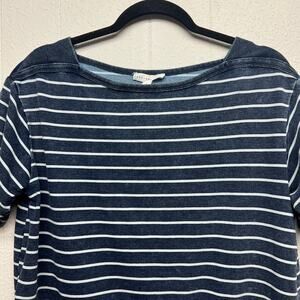 Jane and Delancey women's pullover cropped sweater top. Navy blue & white striped. Boat neck. Drop shoulders. Short sleeves. Contrasting solid trim. Relaxed boxy fit. In good used condition. No stains, tears or holes.