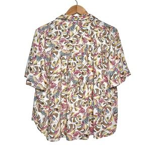 Pre-owned women’s Jane + Delancey tropical gold tinsel stripe button up shirt with all over leaf and parrot print pattern. Lightweight, breathable, and loose fit.