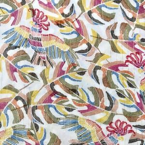 Color - White base with gold tinsel stripe accent and multicolor tropical print pattern