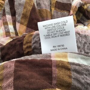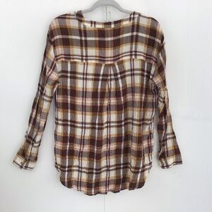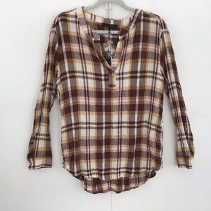 Jane & Delancey brown plaid wrinkled rayon open neck long sleeve tunic S -M NWT