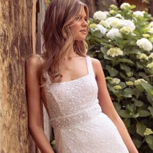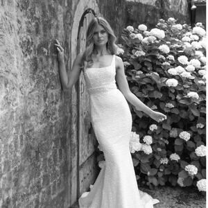 This stunning white Sequined wedding dress is perfect for your special day. Its elegant design and exquisite detailing make it a timeless choice. gorgeous square neck designed with flowing train dress is approximately a size 11