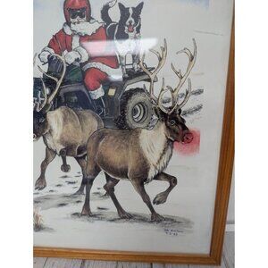 This charming framed print features Santa Claus riding an ATV alongside Rudolph, set against a country backdrop. Perfect for adding a touch of holiday cheer to any room, this piece is a delightful addition to your festive decor.