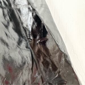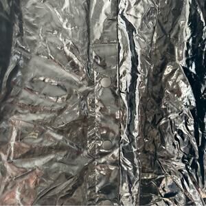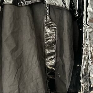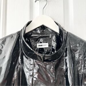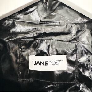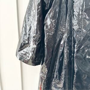 Size 1X from Jane Post. Black patent shiny upper rain coat poncho style jacket. Snap button closure and snap button back vent. High funnel neckline. One pinhole found on sleeve. Barely noticeable and not through the lining. See photos. Preowned.
