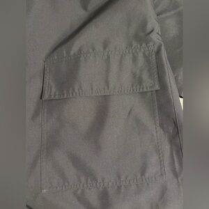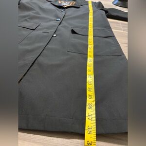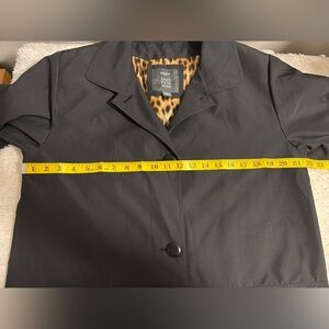 Jane Post for Saks 5th Avenue Long Duster Coat Size Small Black - leopard lining two front square pockets with shoulder pads - Light Weight Button Down Coat
