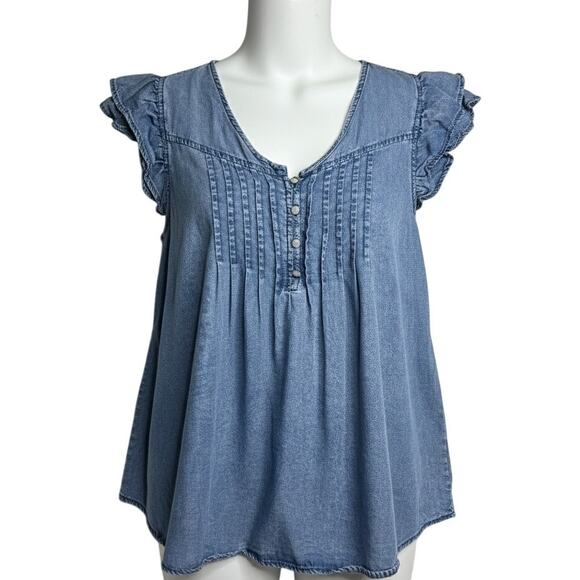 Tags: Chambray Top, Denim Blouse, Sleeveless Blouse, Pintuck Top, Lyocell Top, Jane Delancey, Ruffle Sleeve Top, Cottagecore Blouse, Blue Chambray Top, Flowy Blouse, Summer Shirt, Boho Top, XL Top, Lightweight Blouse