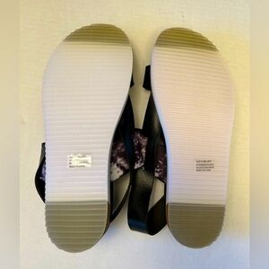 Jane and The Shoe black with moulded comfort footbed easy slip on with elastic strap. 3/4 inch wedge heel & rounded open toe. New sandals. Sz-9