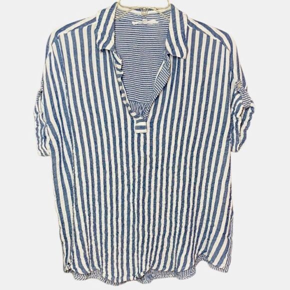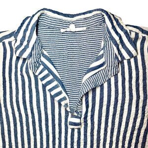 This collared blue & white striped top has button tab cuffed sleeves. The crinkled fabric is perfect for travel. It is made of a lightweight rayon/spandex blend. In excellent used condition.