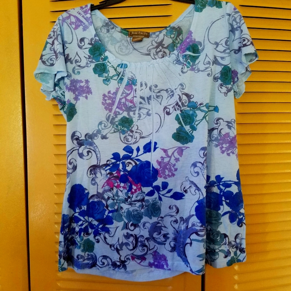 Size L womans top.cape sleeve.shades of blue flower prints.with a spot of purples.scoop neck.like new.