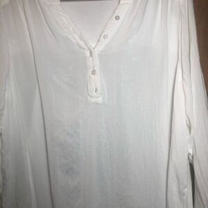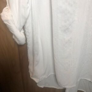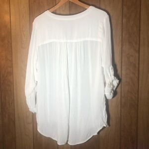 This relaxed white blouse from Jane and Delancey features roll tab sleeves offering a breezy and stylish look. The tunic length and buttoned style make it a versatile addition to any wardrobe, perfect for pairing with various bottoms.