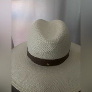 Straw hat with brown leather band. There is an approximately 2x2 inch slight discoloration/stain on one side of the brim but otherwise in good shape!