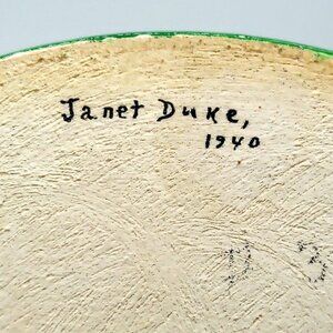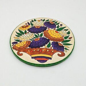 Vintage Janet Duke 1940 floral pottery round trivet with green border.