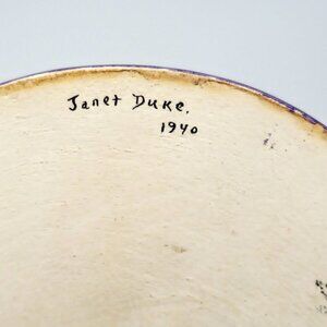 Vintage Janet Duke 1940 floral pottery round trivet with purple border.