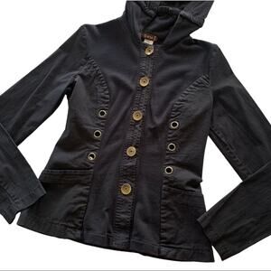 Features: Via Penny Lane Reworked Apparel | Janet Jackson Graphic Black Button Down Hoodie Jacket; One of a kind nostalgic pieces with a modern twist. XCVI black rivet detail hooded jacket, Janet Jackson graphic sewn onto the back.
