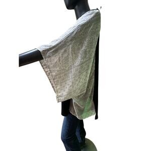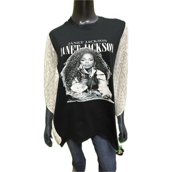 One-of-a-kind upcycled Janet Jackson graphic tee featuring bold front print with portrait design. Unique mixed-media style and contrasting patterned wide sleeves. Relaxed oversized fit with asymmetrical hemline. Perfect for layering, styling with jeans, or wearing as a statement piece.