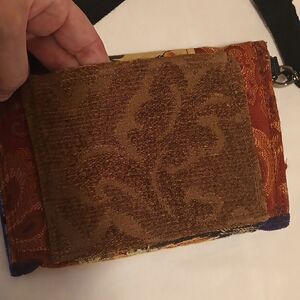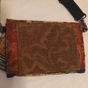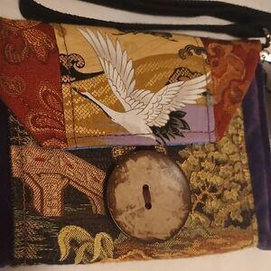 Beautiful MJCK designs small crossbody made with repurposed textiles , brocades, perfect little evening bag button flap with a pocket, a back pocket and a small inside slip pocket purse measures 7.5" L X 5.5" H with a 24" drop, long cotton shoulder strap is adjustable, removable Handmade in Great Barrington MA wearable art