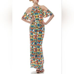 Vibrant floral off-shoulder jumpsuit perfect for any occasion. Features a colorful pattern that stands out.