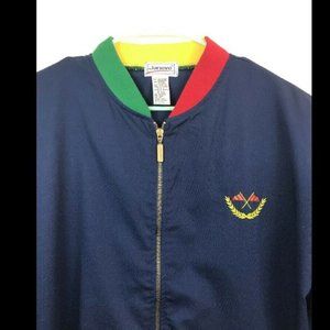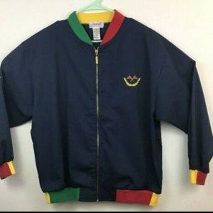Vintage color block jacket, size M, brand Janeve. Very good condition. 55% Polyester 35% cotton. Neck, cuff and bottom all banded. Hip pockets and emblem embroidered on right sleeve. Approximate measurements are armpit to armpit 24 inches, body length 26 inches and sleeve 32 inches. See pics for more details.