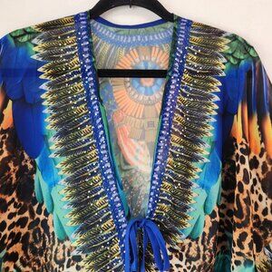 This kimono poncho is absolutely beautiful and ready for Fall, Spring, or Summer! It features a tie-front style, arm holes, tropical animal bird print, and perfect for the pool or styles for everyday wear!