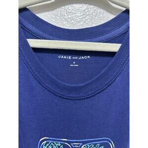 The Janie and Jack Boys T-Shirt in size 8 is a stylish and comfortable option for young boys. Made from soft cotton material, this short sleeve shirt features a fun design of sunglasses, perfect for a beach or outdoor theme. The alluring blue color and boy character make it a great choice for any casual outfit.