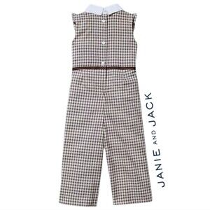 Janie And Jack Girls Tan Houndstooth Jumpsuit Ruffle Crisp White Collar Size 5