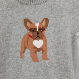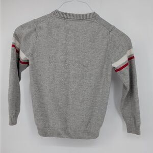 Cozy gray sweater featuring a cute dog design. Red and white accents on the sleeves add a playful touch.