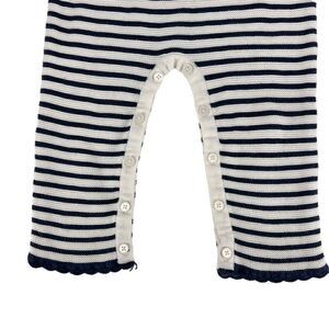 One piece outfit that buttons around the legs. Thick knit 100% cotton. Colors are navy blue and white with a pink whale and bow. So cute for the beach.