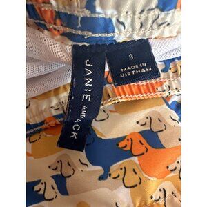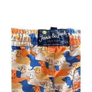 These boys' swim trunks by Janie & Jack feature a vibrant dachshund print in blue, orange, and yellow. Designed in size 3 with an elastic waistband for comfortable wear.