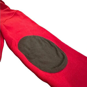 Soft, bright red pullover from Janie and Jack. Sweatshirt like material; shawl collar with toggle buttons; decorative felt elbow patches. Classic and preppy.