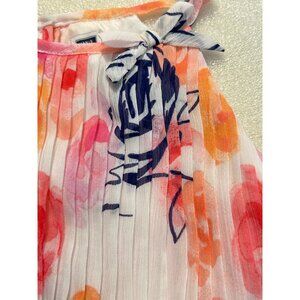 Beautiful watercolor print featuring roses and sweet accordion pleats throughout. Sleeveless. Round neck. The swingy chiffon style is finished with a matching bow accent at the neckline and keyhole button back. No waist. Lined. Pullover. Color: Paradise Rose Print, which consists of a white background with a navy blue, pink, orange, coral, peach and pink design. 100% polyester chiffon. Machine washable. abstract, floral, rosette, patterned, pleated, flowy, a-line, shift dress, twirl, spring, summer, vacation, wedding, flower girl, special occasion, easter, birthday, party, cocktail, tank dress, girly, fancy, baby girl dress, crinkle, sun dress, dressy