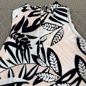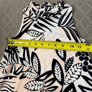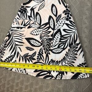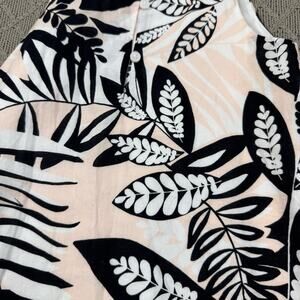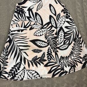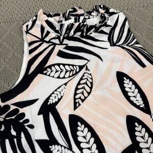 Chic sleeveless dress with a bold black and white leaf pattern over a nude/blush pink. Gorgeous & bold. Pretty ruffled neckline.