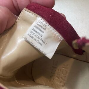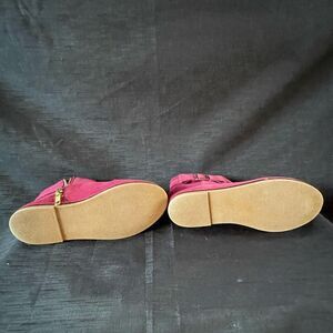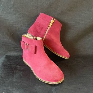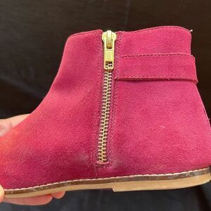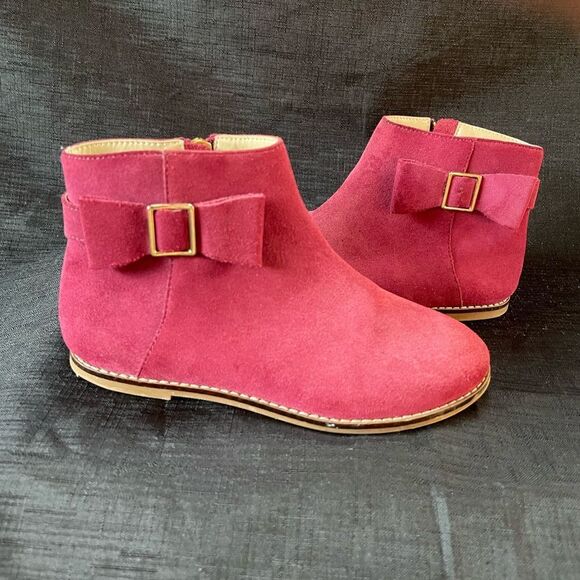 Great pair of maroon suede and leather boots from Janie & Jack. Bow detail with gold finished hardware. Some signs of wear on inner heel of right boot but no other call outs for this gently worn boots!