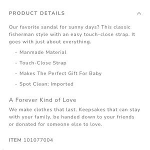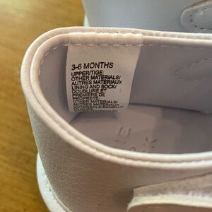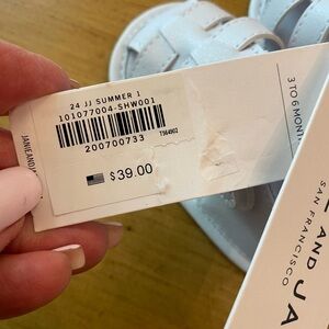 New Jamie and Jack 3 to 6 month white lightweight sandal. They have a Velcro attachment and are very lightweight. They are made of man-made materials. They sold in the stores for $39 and they are sold out. 🌻