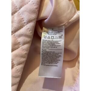 Size 8. Bubblegum pink quilted velour. Front pockets. Cap sleeves with chest bow detail. Back button closure. Fully lined.