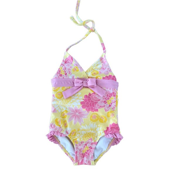 Janie & Jack | Pink & Yellow Floral Ruffled One-Piece Swimsuit | Size 18-24M