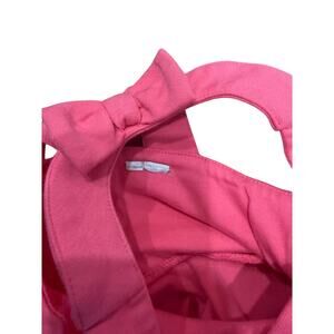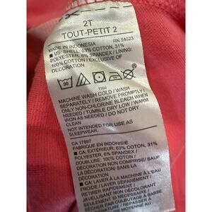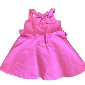 Adorable pink ponte knit dress in toddler size 2T with sleeveless tank-style straps, a sweet back bow, decorative buttons, and a ruffle waist trimmed with white floral crochet lace. Made from a comfy cotton/poly/spandex blend that offers stretch and structure. Great for summer, birthdays, or casual dress-up days. Tag with brand/size has been removed, but interior care tag confirms size (2T) and details.