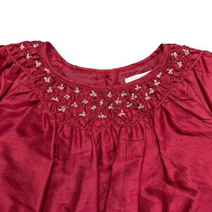 “Uptown Holiday” dress from Janie & Jack. Deep maroon raw silk with smocking at the chest. Decorative belt/bow detail at the waist; four button closure at the back; fully-lined.