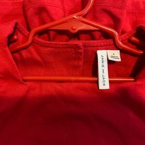 Janie & Jack Red Scalloped and Ruffle Hem Ponte Dress. Size 6. Cotton, Polyester, and Spandex. Half back button with gold like buttons. Smoke free and pet free home.