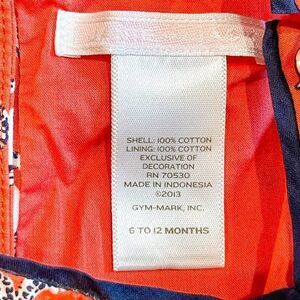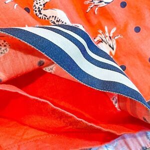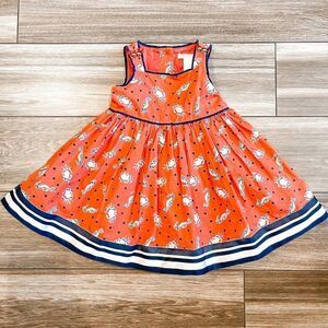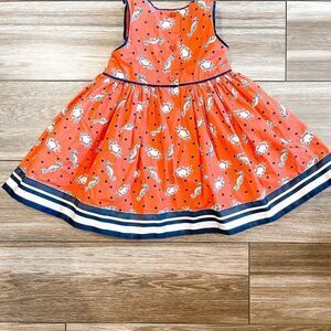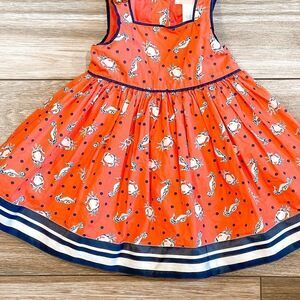 Print features crabs, seahorses, and polka dots with nautical blue/white hem. Gold Buttons on shoulders.