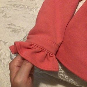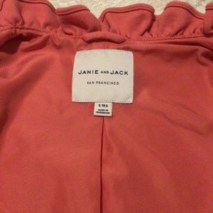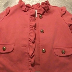 Janie & Jack Soft Ponte Pink Ruffle Jacket, size 5 to 6. Soft pink ponte fabric with stretch. Ruffles on the neck, shoulders, down the lapel and on the sleeves, cute and bold gold buttons down the front and on the front pocket. Pairs with the matching pink ponte leggings in my listings to make a matching set!